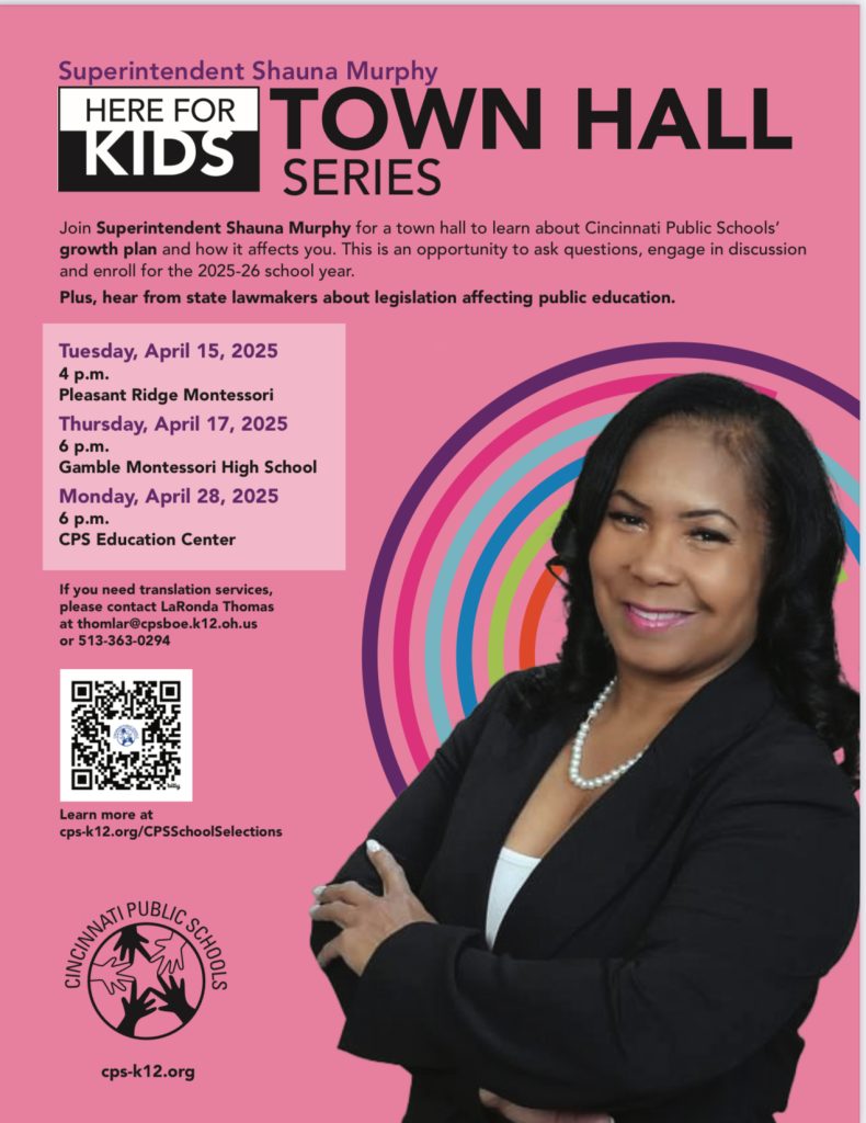 Join Superintendent Shauna Murphy for a Town Hall to learn about Cincinnati Public Schools’ growth plan and how it affects you. This is an opportunity to ask questions, engage in discussion and enroll for the 2025-26 school year.