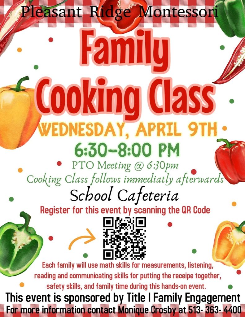 Come join us on Wednesday, April 9th immediately following the PTO Meeting at 6:30pm – Family Cooking Class will be in the cafeteria and is for all ages. Please enter through the back playground doors. Food provided.