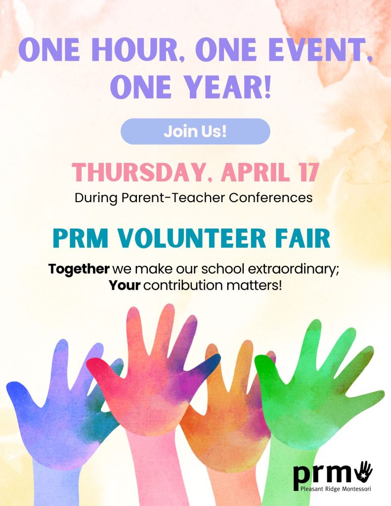 Join us for a Volunteer Fair during Parent-Teacher Conferences, where we’ll highlight how “One Hour, One Event, One Year” can make a difference at PRM!